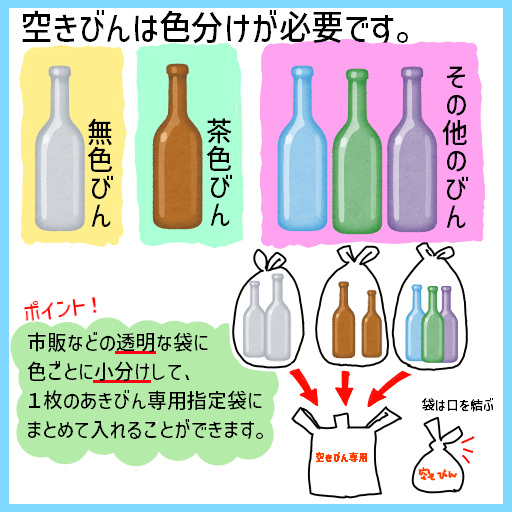 ★【小分け可能】それぞれを、市販等の透明ビニール袋に入れて小分けし、一枚の空きびん用指定袋に入れることもできます。