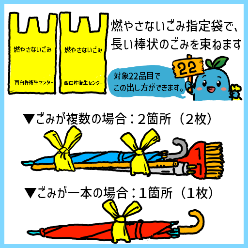 長い棒状のごみの出し方 ●指定ごみ袋に収まらない【対象の22品目のごみ】のごみの出し方です。【以下の22種以外の指定袋に収まらないごみは粗大ごみになります。衛生センターへ持ち込んでください。】