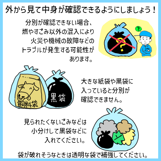 【火災に繋がる恐れあり】中身を確認することができないと、分別誤りや危険物(刃物など鋭利な物や発火危険性のある物)が混ざっていても、確認し取り除くことができません。危険物が混入していることで、作業中の作業員がケガをしたり、ごみ収集車や処理工場での事故や火災につながる恐れがあります。