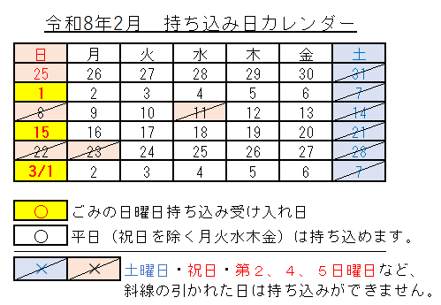 令和8年2月のごみの受付について 【第1週・第3週の日曜日】の受付時間は、